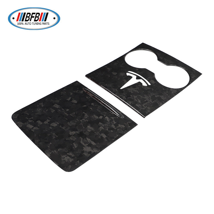 100% Real Carbon Fiber Center Console Panel Cup Holder Cover Storage Box Cover - For Tesla Model Y 3 - Forged Pattern New Version