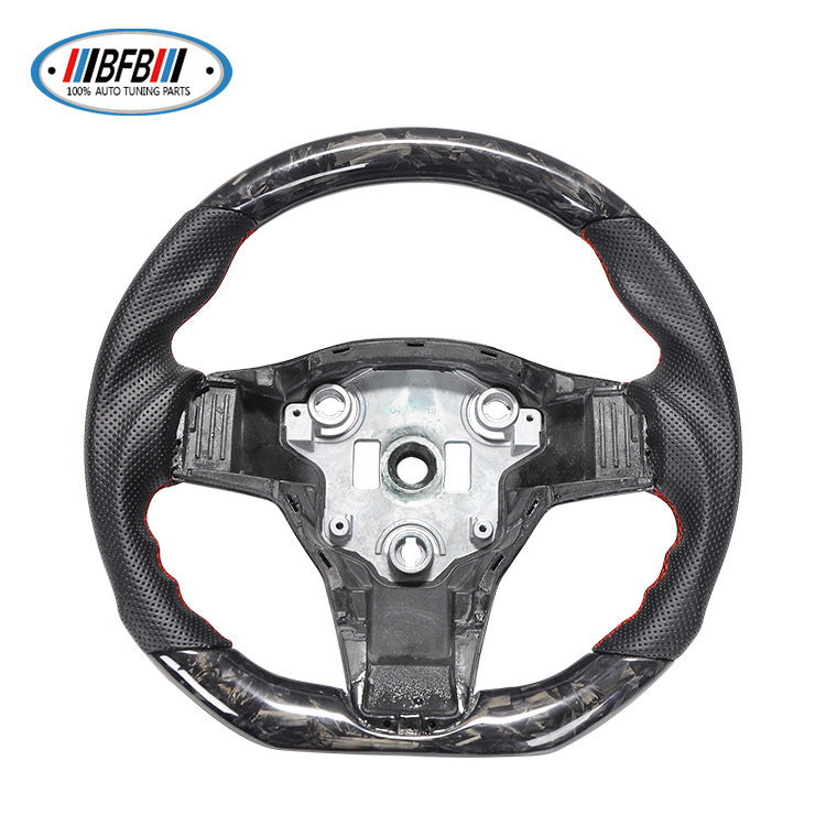 100% Real Carbon Fiber Forged Steering Wheel with Black Perforated Leather and Red Stitching – For Tesla Model Y – Modification
