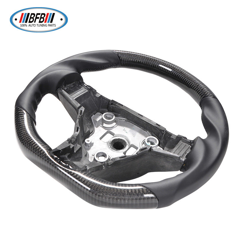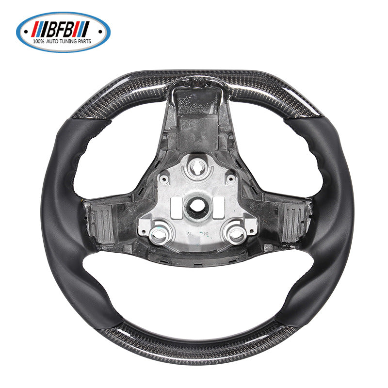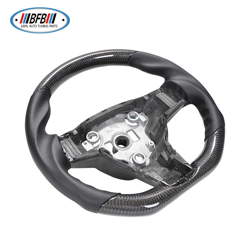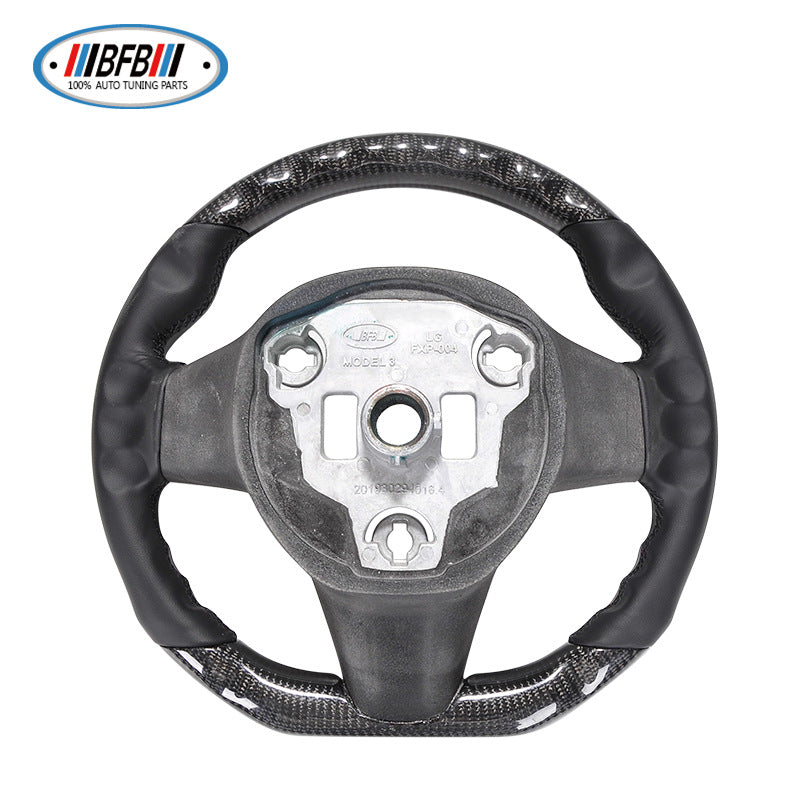 100% Real Carbon Fiber Glossy Black No-Hole Steering Wheel Cover – For Tesla Model 3 Y – Black Leather Stitching Modification