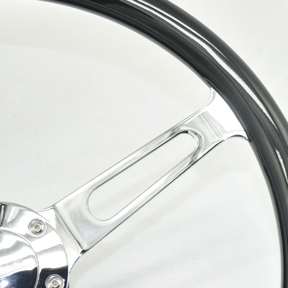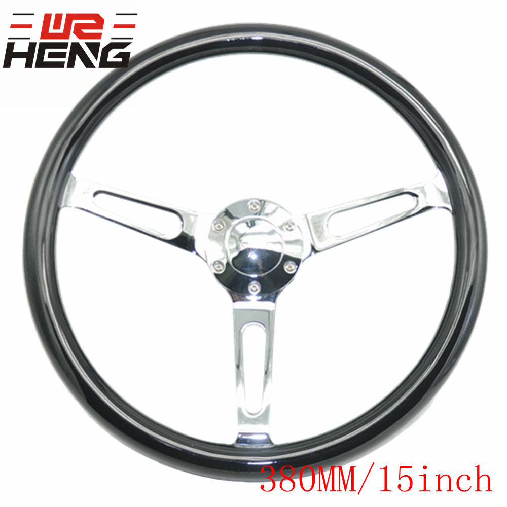 Classic Car Steering Wheel – Bright Black Stainless Steel Spokes Wood 380MM 15 Inch 6 Holes Universal