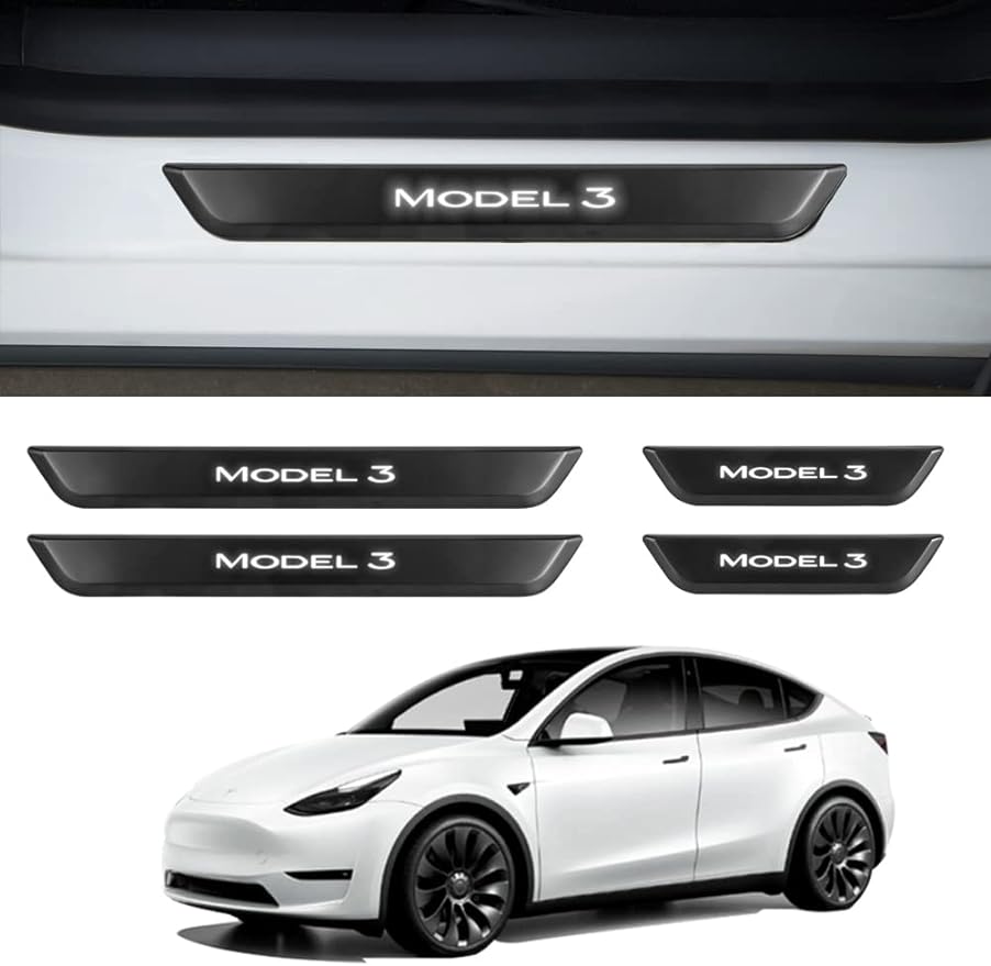 HANSSHOW Door Sill Protector with LED Light for Tesla Model 3 2017-2023, 4 Pieces Front/Rear Illuminated Door sill, Magnetically Controlled Illuminated Door Edge Guards Anti-Scratch