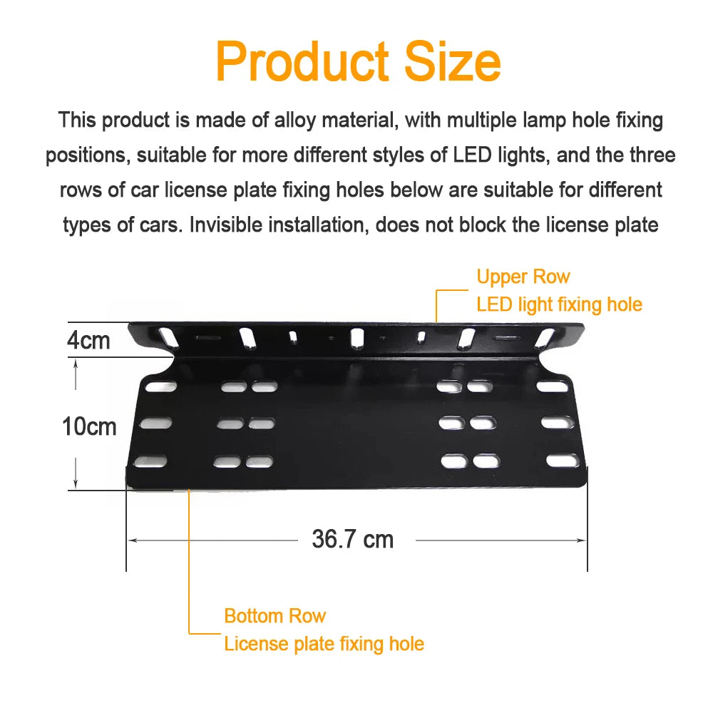 This product is made of alloy material, with multiple lamp hole fixing positions, suitable for more different styles of LED lights, and the three rows of car license plate fixing holes below are suitable for different types of cars. Invisible installation, does not block the license plate